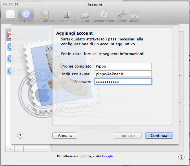 2) Cliccare sull’icona + in basso a sinistra, si apre la finestra “aggiungi account”. Insrite un nome per l’account, il vostro indirizzo email e la password.